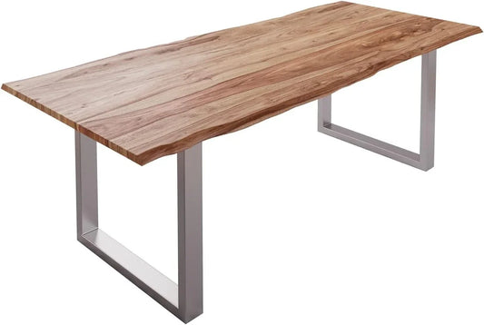 Sahajhast Solid Sheesham Wood Dining Table with Real Wane Edge and Silver U-Frame Base – Natural Finish