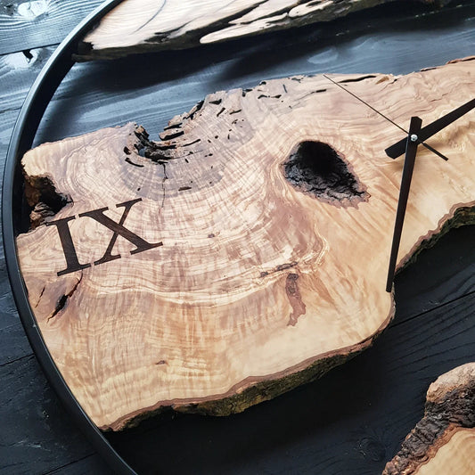 Sahaj Hast Olive Wood Wall Clock – Silent Movement, Live Edge Farmhouse Style | Handmade Wooden Wall Art