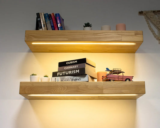 Elegant Pine Wall Shelves with LED Lights – Adjustable Brightness & Color | Handcrafted in Solid Pine Wood